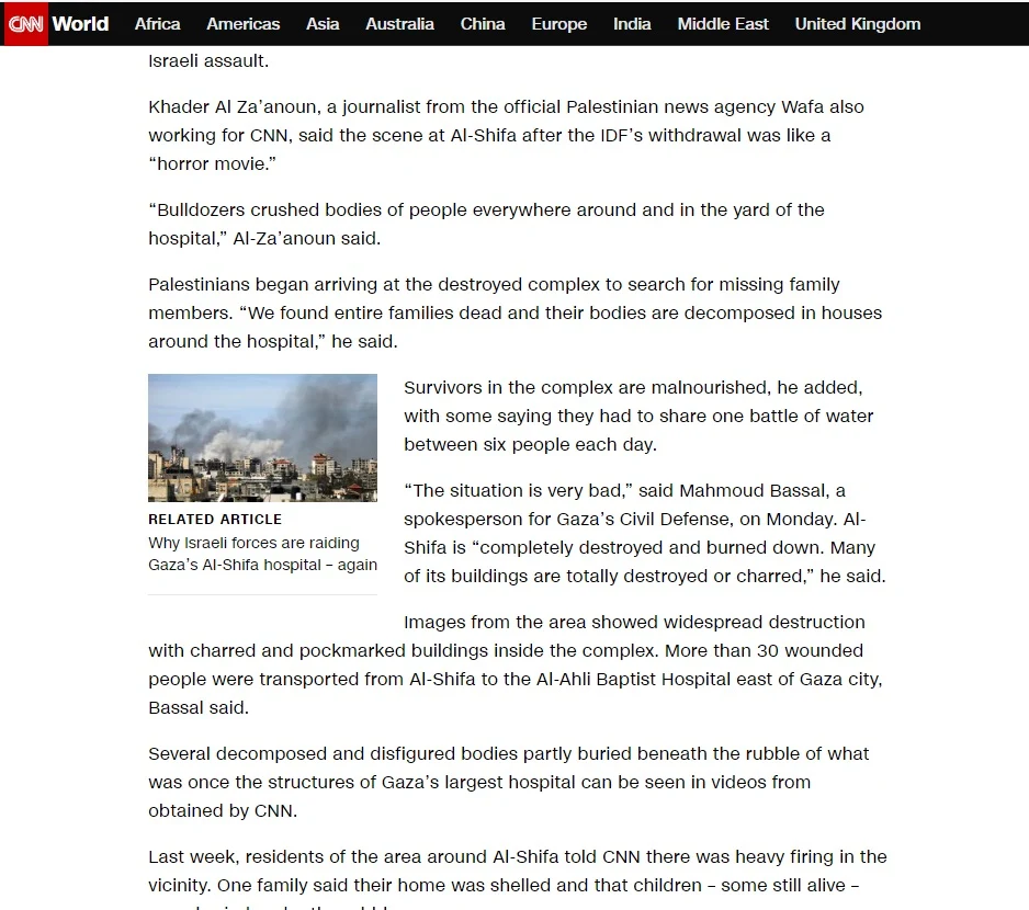 A journalist working for the American network CNN described the scene at Al-Shifa Hospital in Gaza on Monday after the withdrawal of Israeli forces from the medical complex, noting that it looked like a "horror movie."
